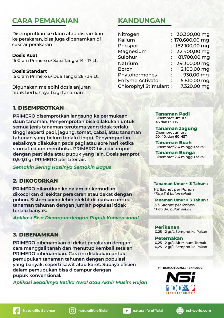 PRIMERO Merupakan terobosan baru dalam teknologi pemupukan dengan Teknologi Nano, Effervescent & Phytohormon. Diformulasi khusus dari bahan - bahan berkualitas tinggi dengan Teknologi Nano berukuran partikel 10-9m. Memiliki 13 kandungan unsur Hara yang merupakan makanan siap saji untuk tanaman & aman untuk kelestarian alam.